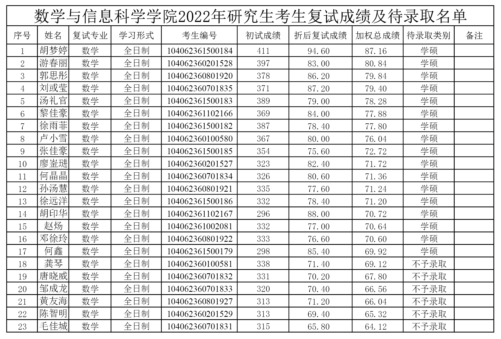 数学与信息科学学院关于公布2022年研招考生折后复试成绩、加权总成绩及待录取名单的通知